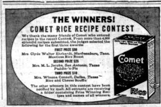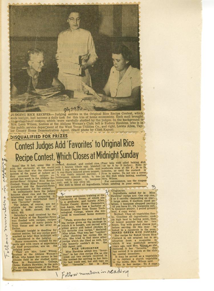 Rice recipe contests have history and tradition in Texas. In 1951, The Texas Rice Promotion Association and the Abilene Reporter-News have announced a rice recipe contest. The contest was well documented and communicated in The Abilene Reporter-News. Recipes were received from fourteen towns and in multiple categories. The judges were overwhelmed by the success and diversity of recipes featuring Chinese, Hungarian, Syrian, Indian, Uruguayan and other recipes. Read on the stories and the fine print.